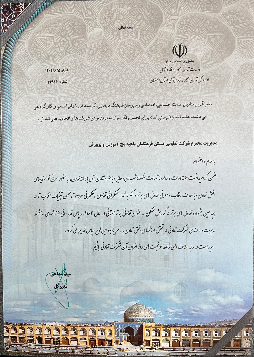 تعاونی مسکن فرهنگیان ناحیه 5 تعاونی برتر استانی در سال 1402